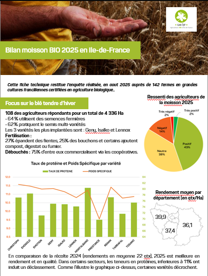 La moisson 2025 restera marquée par un démarrage particulièrement précoce, dès la fin juin. Dans l’ensemble, les conditions ont été plus favorables que l’an passé, ce qui a permis une récolte globalement meilleure, même si les résultats sont hétérogènes en fonction des cultures et que le sujet des prix reste le nerf de la guerre. Comme l'an dernier, les conseillers du pôle agricole ont enquêté auprès des fermes bio en grandes cultures. Retrouvez une analyse globale de la moisson 2025 et la fiche technique, réalisées grâce aux réponses de 142 producteurs, soit près de 50% des fermes GC Bio franciliennes.